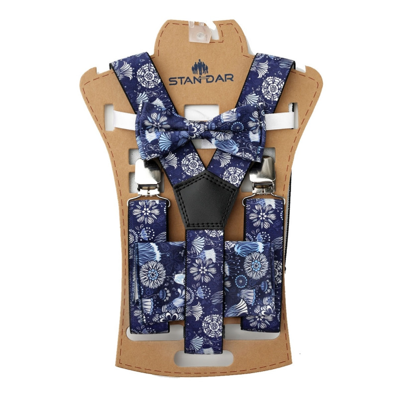 Sada podväzkového motýlika pre dieťa v námorníckej modrej s módnymi bordovými vzormi.